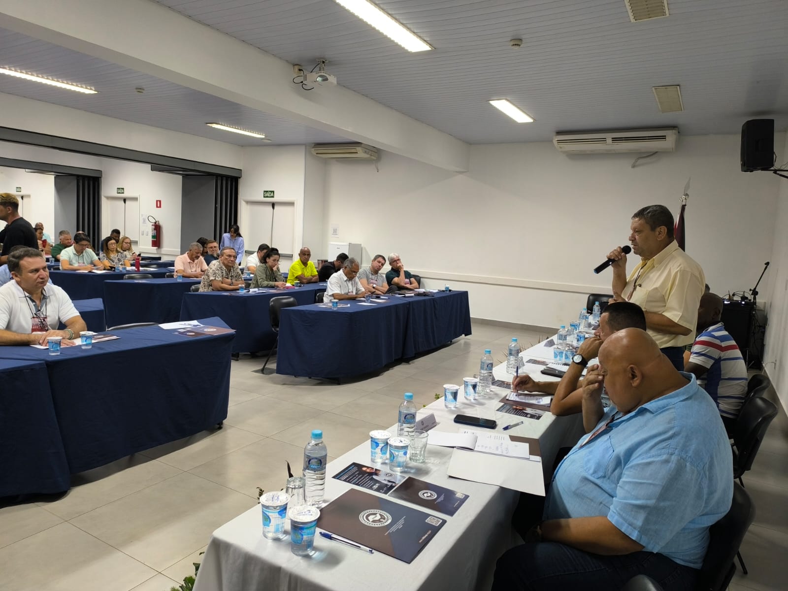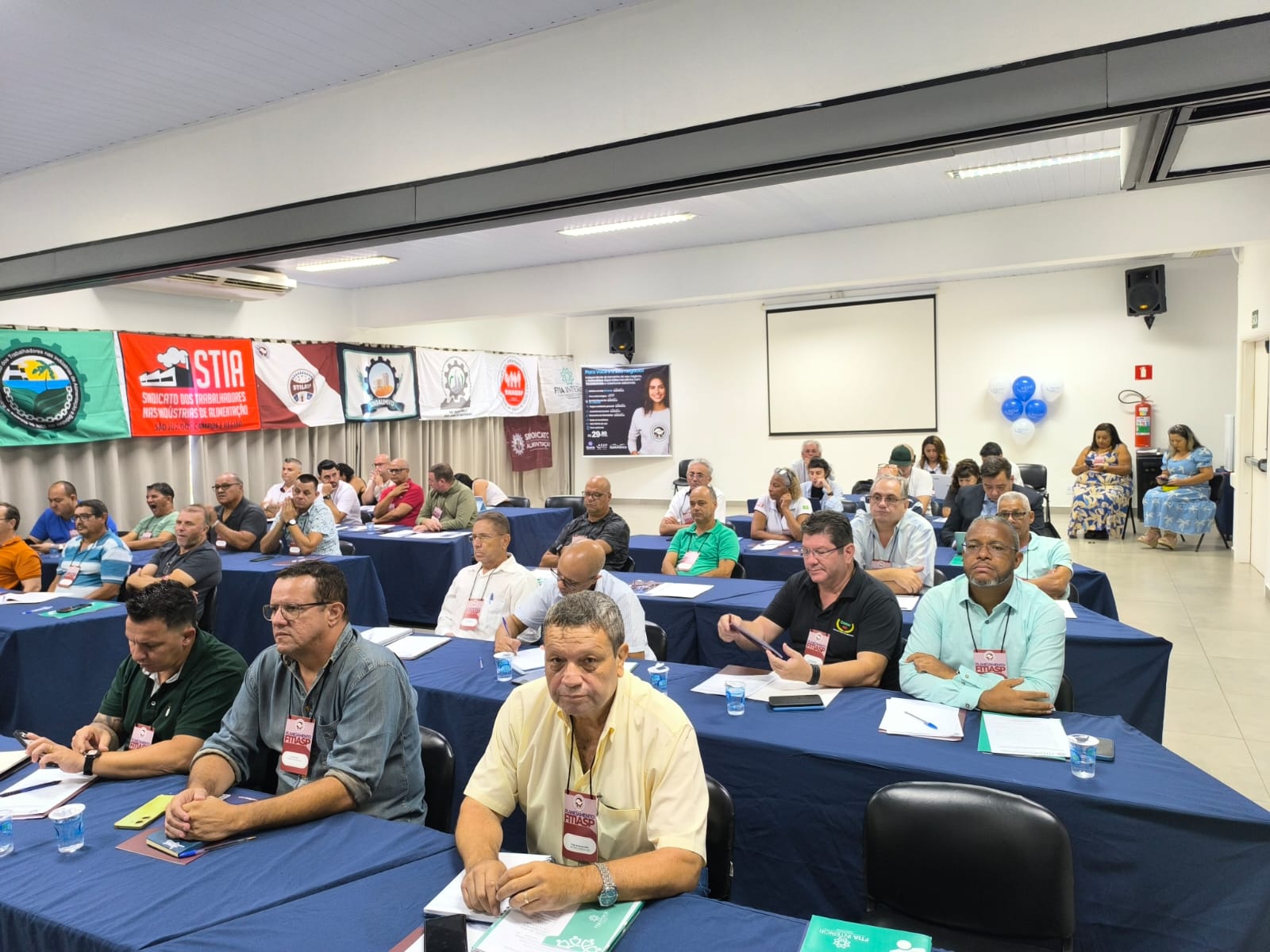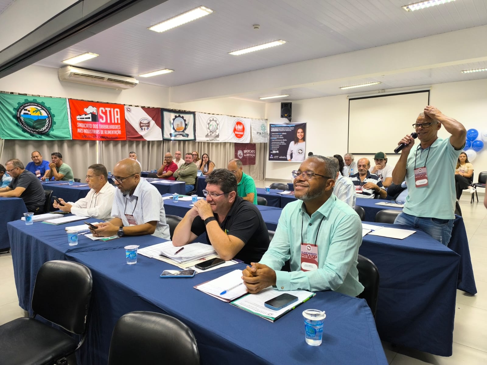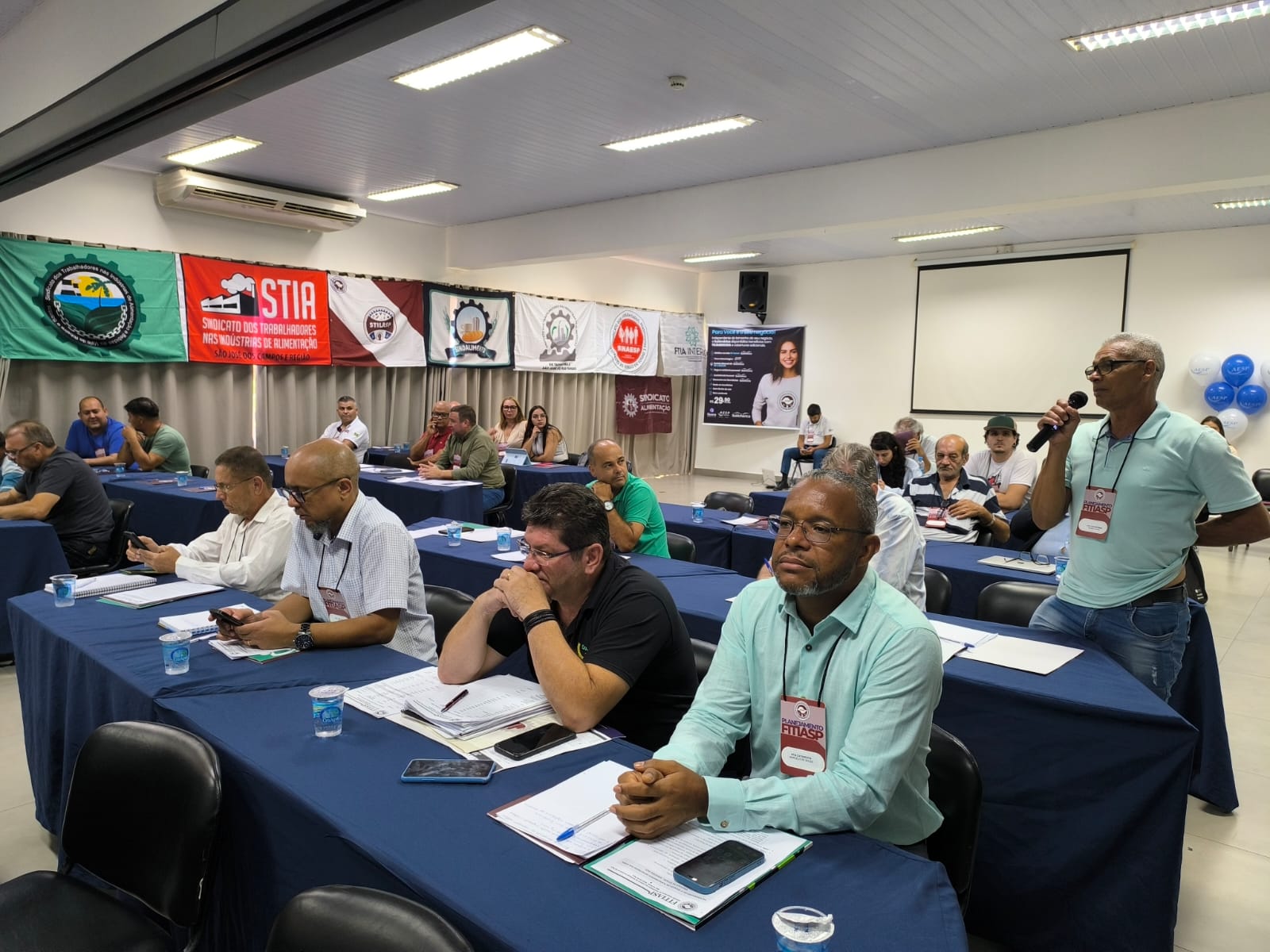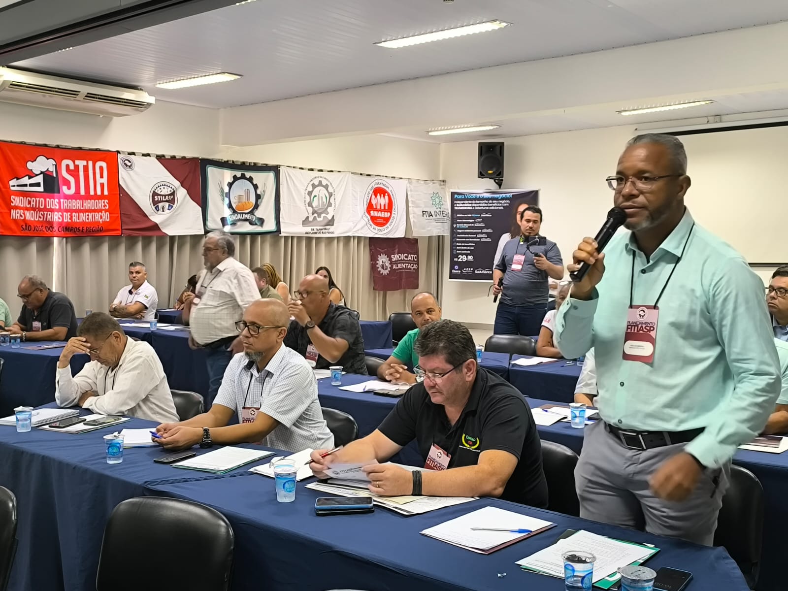 Em seguida, os sindicatos participantes se apresentaram e puderam lançar uma pergunta ao palestrantes, contribuindo com as discussões em pauta. Já próximo ao horário do almoço, foi feita uma rápida retrospectiva das negociações coletivas de 2024 e apresentada a principal bandeira e discussão de 2025: Fim da Jornada 6x1.